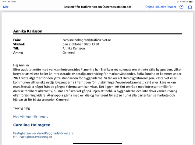 Efter avslutat möte med verksamhetsområdet Planering har Trafikverket nu enats om att inte sälja byggnaden, vilket betyder att vi inte heller är intresserade av detaljplaneändring för markanvändandet. Sofia Sundholm kommer under 2021 vidta åtgärder för den yttre standarden för byggnaderna. Vi tänker att Hembygdsföreningen, Västarvet eller kommunen vill kanske nyttja byggnaderna i framtiden för utställningar/museiverksamhet , café eller kanske kan man återställa något från de gångna tiderna som kan visas. Det ligger i ett fint område med intressant miljö för diverse tänkbara alternativ, nu när Trafikverket går på linjen att behålla byggnaderna och inte driva varken rivning eller försäljning vidare. Återkoppla gärna med ev. dialog framgent för att se hur vi alla parter kan samarbeta och hjälpas åt för bästa scenario i Öxnered.