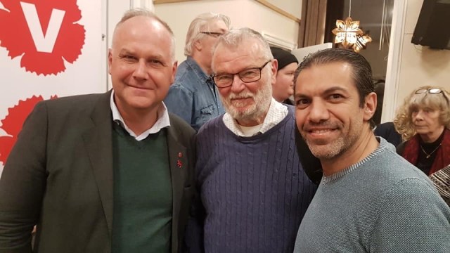 Men tillbaka till Dals-Ed. Jonas ”skulle ju inte” ställa upp för obligatoriska selfies, men han gjorde det ändå. (Med på bilden finns Ahmad, min syriske vän som bor i Dals-Ed, bilden togs av Stefan Kärvling, partikamraten i Vänersborg.)