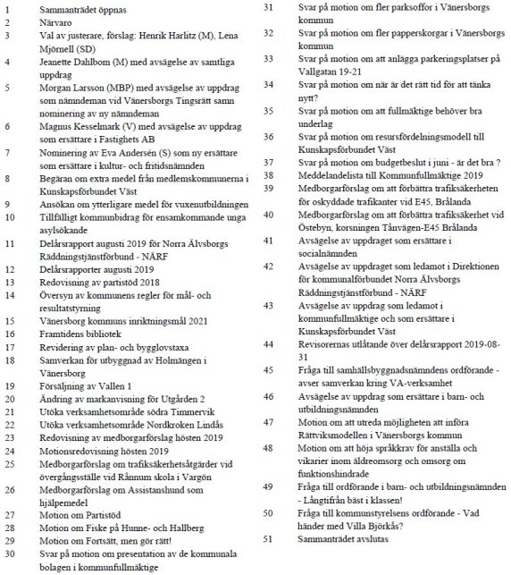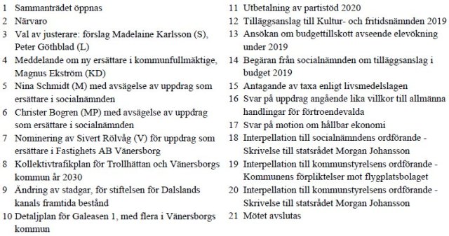 Vad finns i kallelsen? Listan är kort, har blivit lite längre idag genom ärenden som tillfogats i sista stund.