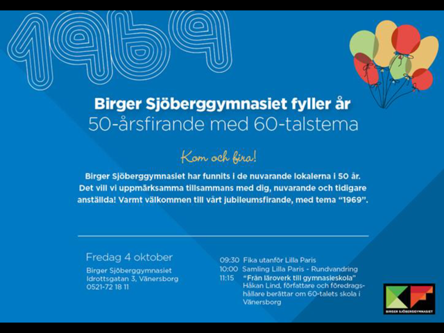 Tack för en mycket trevlig förmiddag, dagens skolledning och dagens lärare var så snälla mot oss tjugotal gamlingar, eleverna log vänligt mot oss och hejade glatt när vi vandrade runt i finfina och fräscha lokaler. Och ett extra tack till Astrid Karlsson-Björkman som med sin minnesbild från första arbetsdagen i augusti 1969 blev ”vårt” bidrag. Och till Håkan Lind, som hade laddat upp mängder av bilder för sitt kåseri om vägen från apologistskolan till Birger Sjöberggymnasiet i Vänersborg.